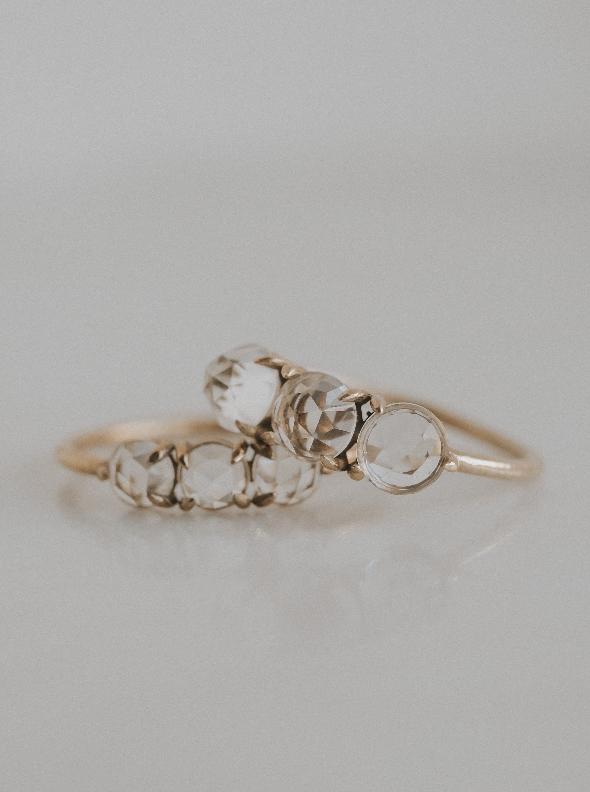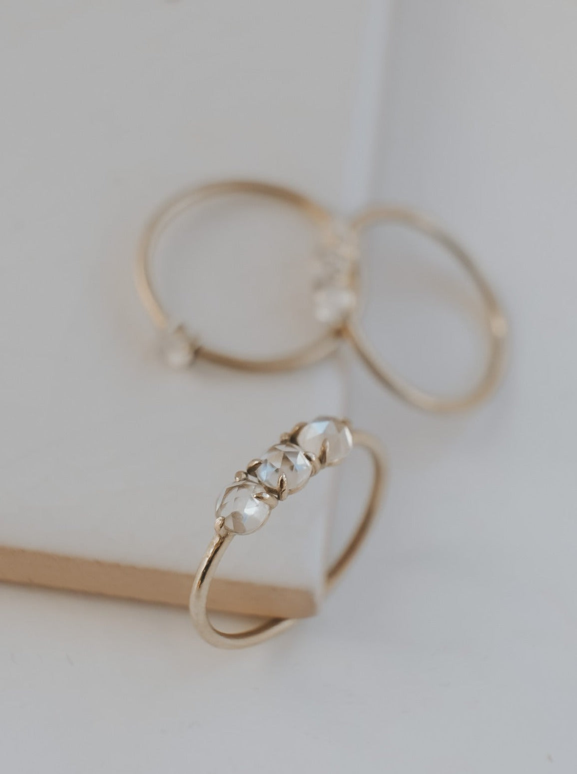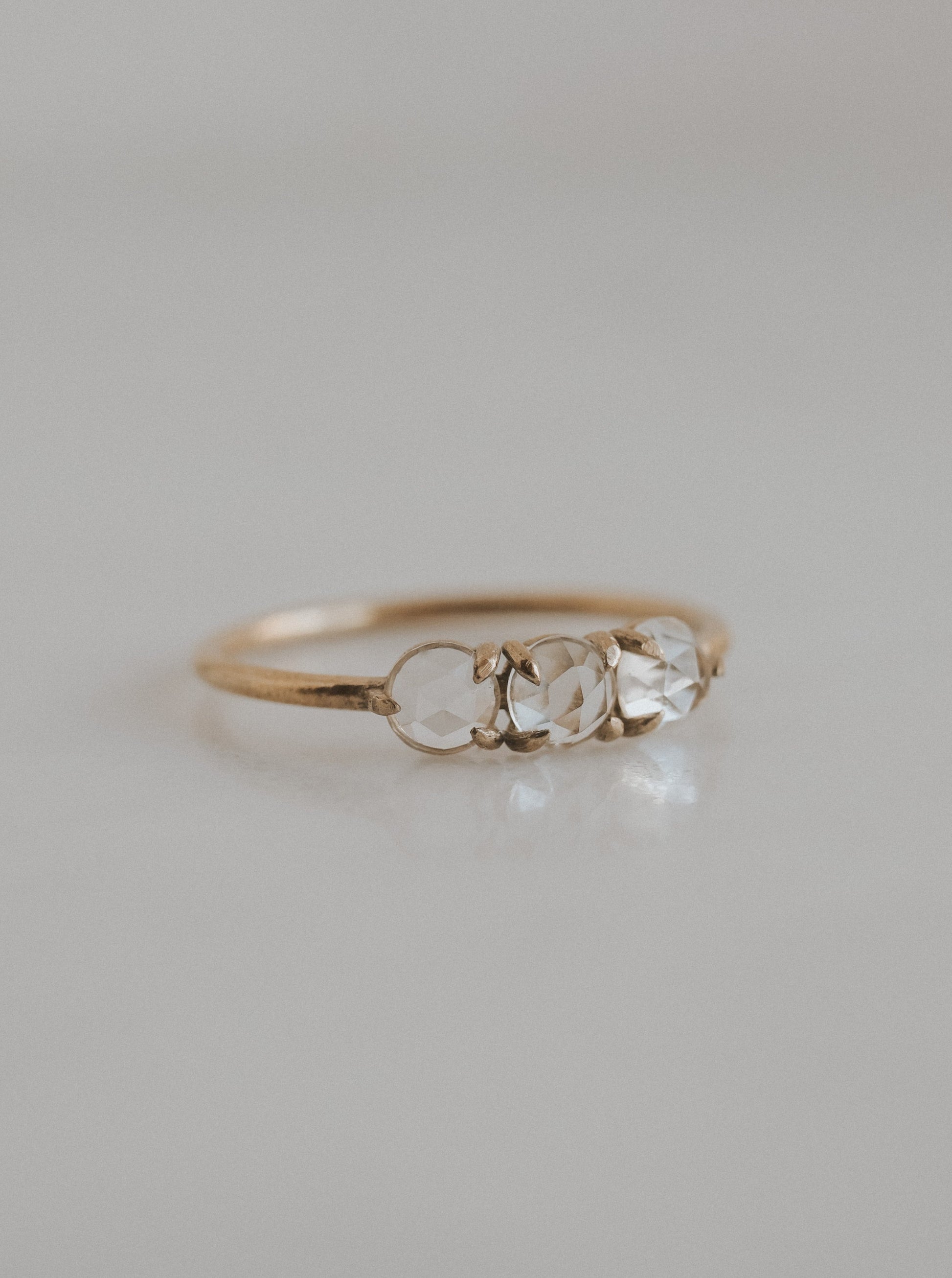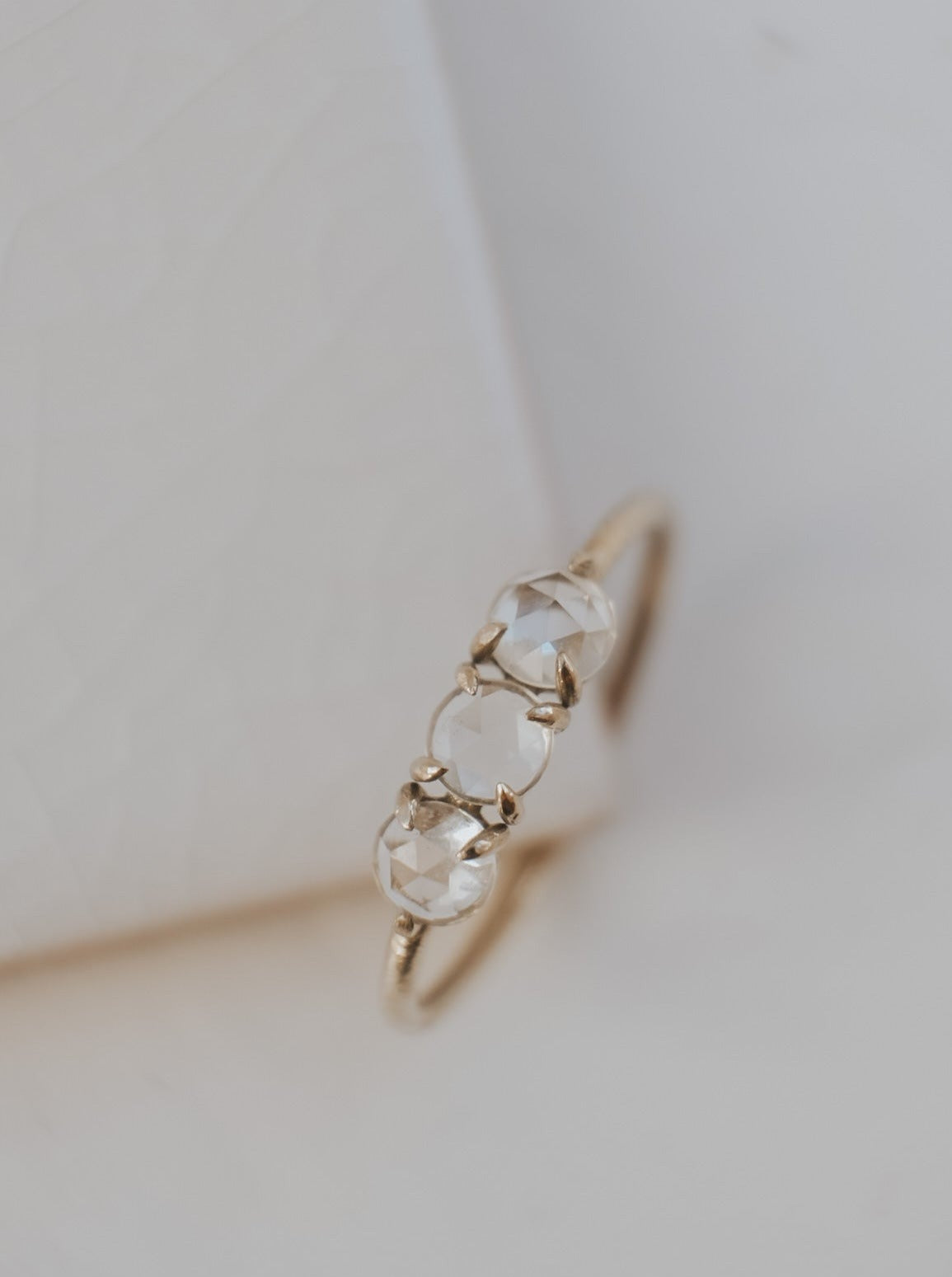Lily Petite is the little sister of Lily Luxe, the difference being the size of the stone. Lilly Petite has three 4mm rose cut topaz where as the Lily Luxe has three 5mm rose cut topaz. For comparison both can be seen along side each other in the last four photos of this listing. Click here to view Lily Luxe.