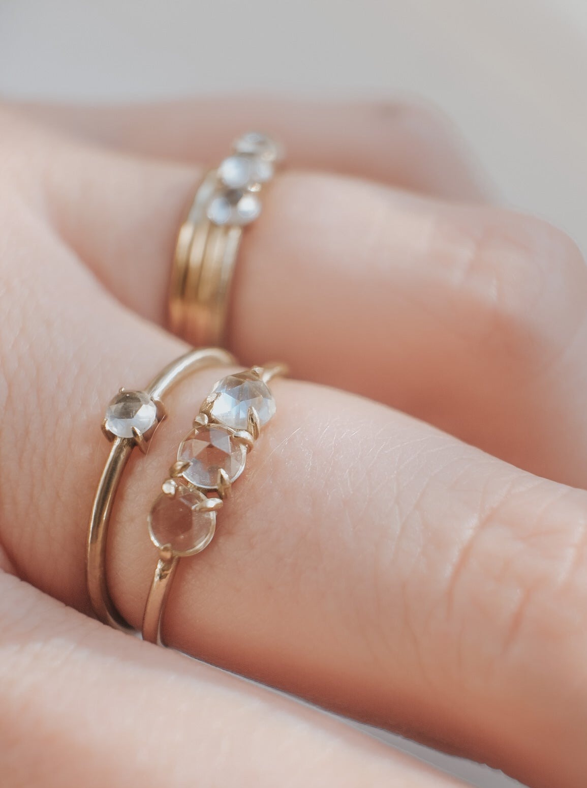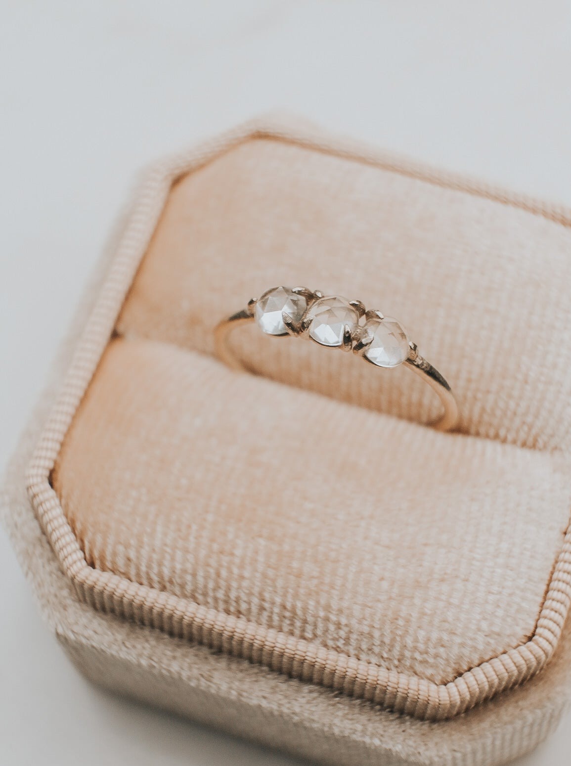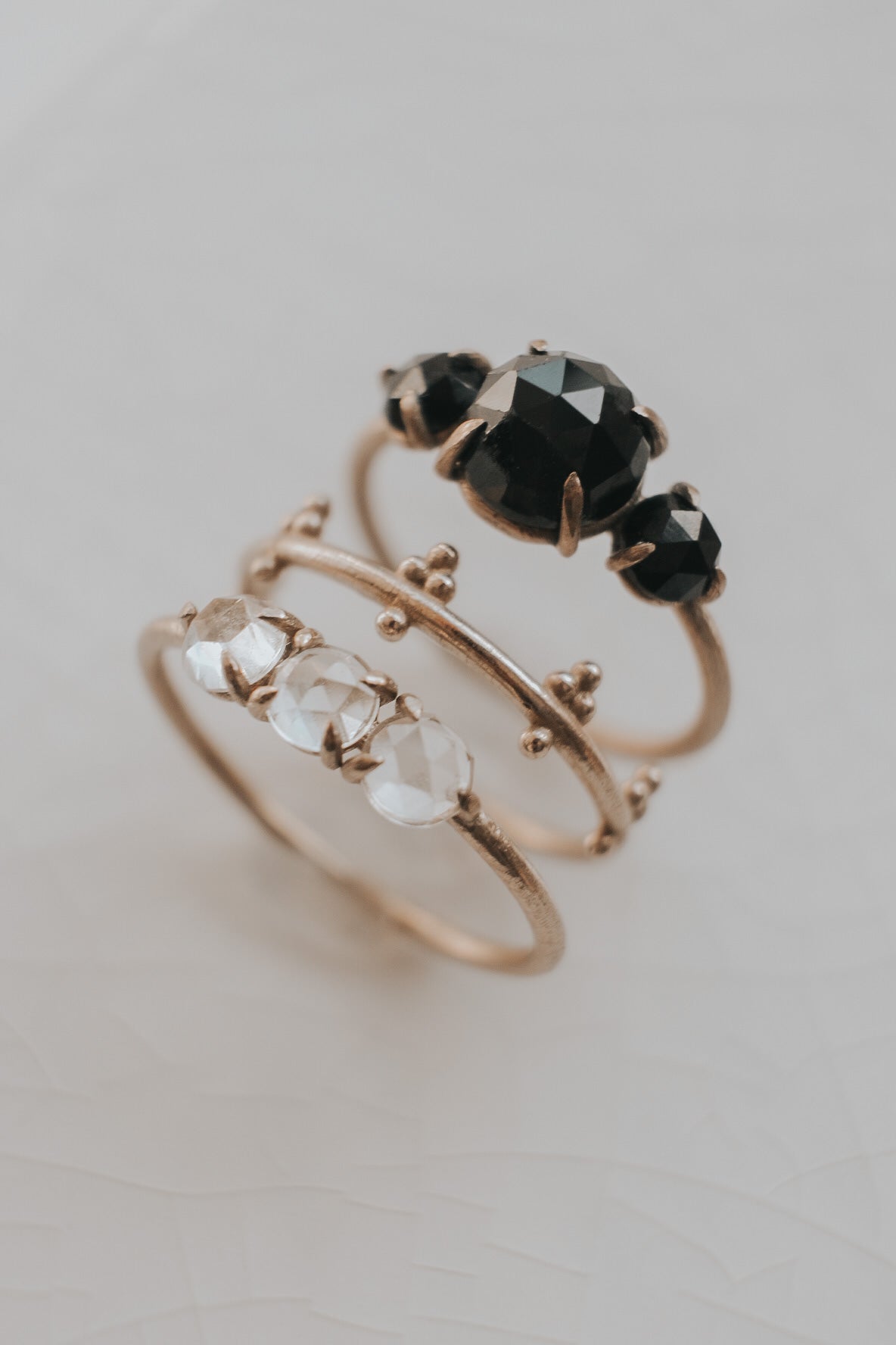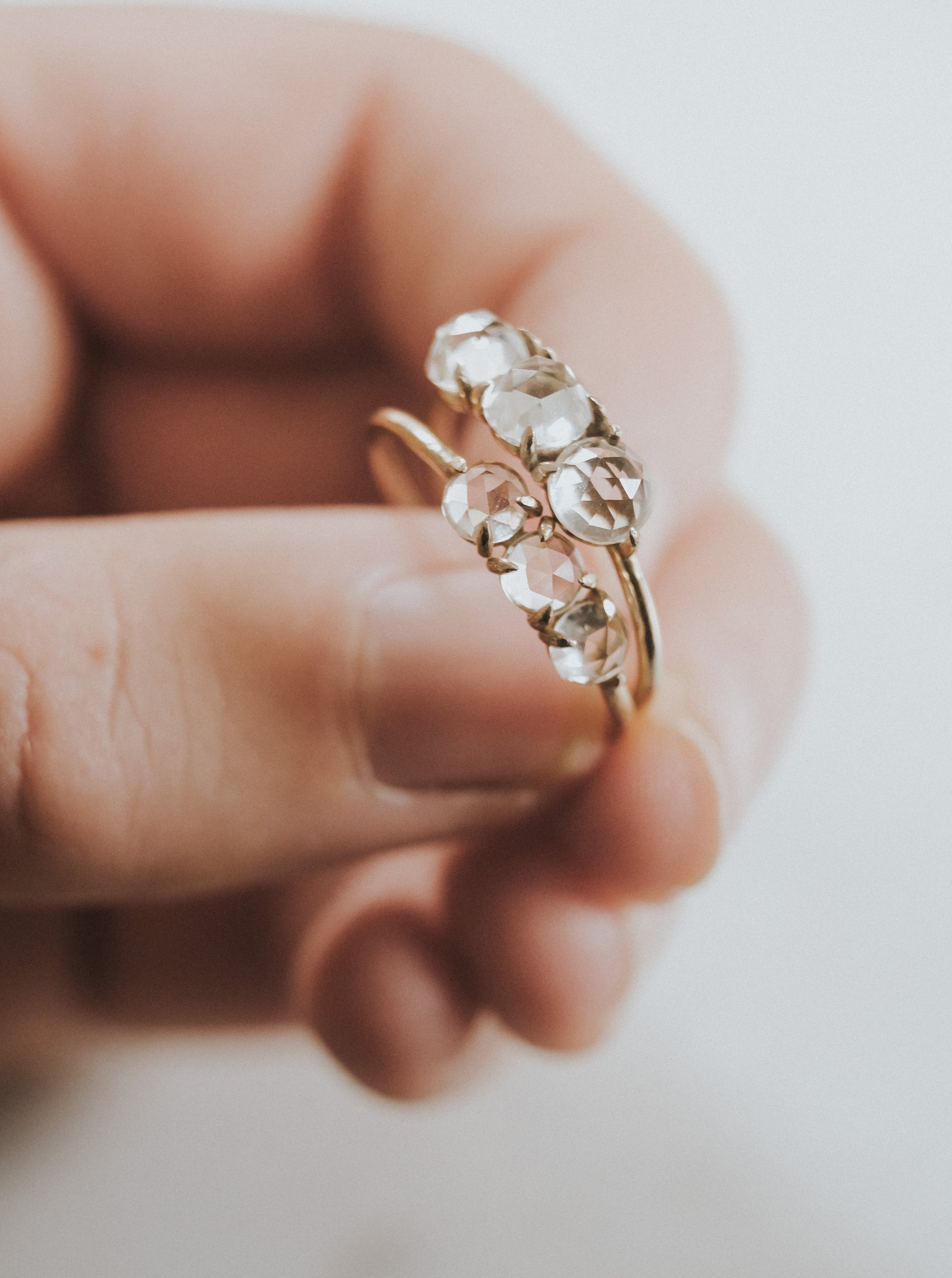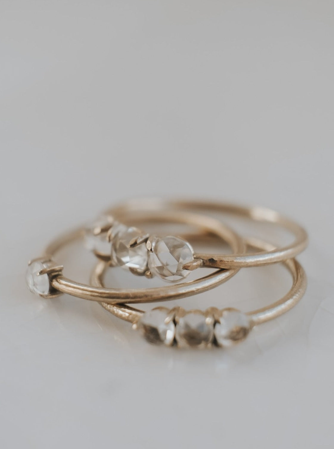 Lily Petite is the little sister of Lily Luxe, the difference being the size of the stone. Lilly Petite has three 4mm rose cut topaz where as the Lily Luxe has three 5mm rose cut topaz. For comparison both can be seen along side each other in the last four photos of this listing. Click here to view Lily Luxe.