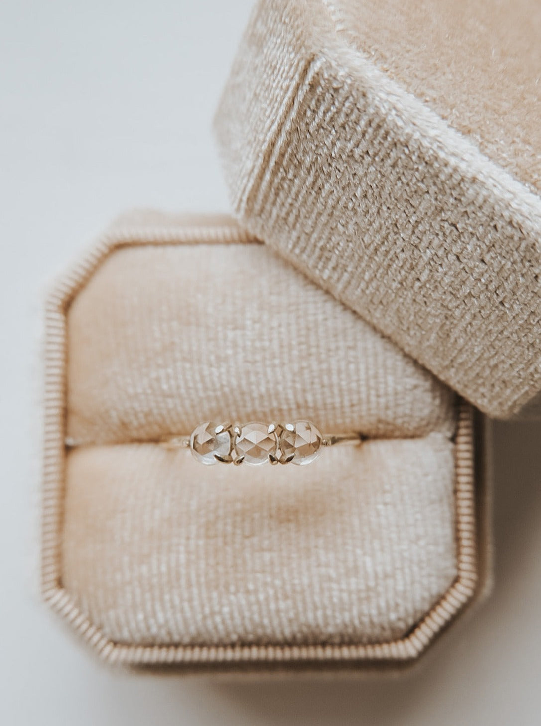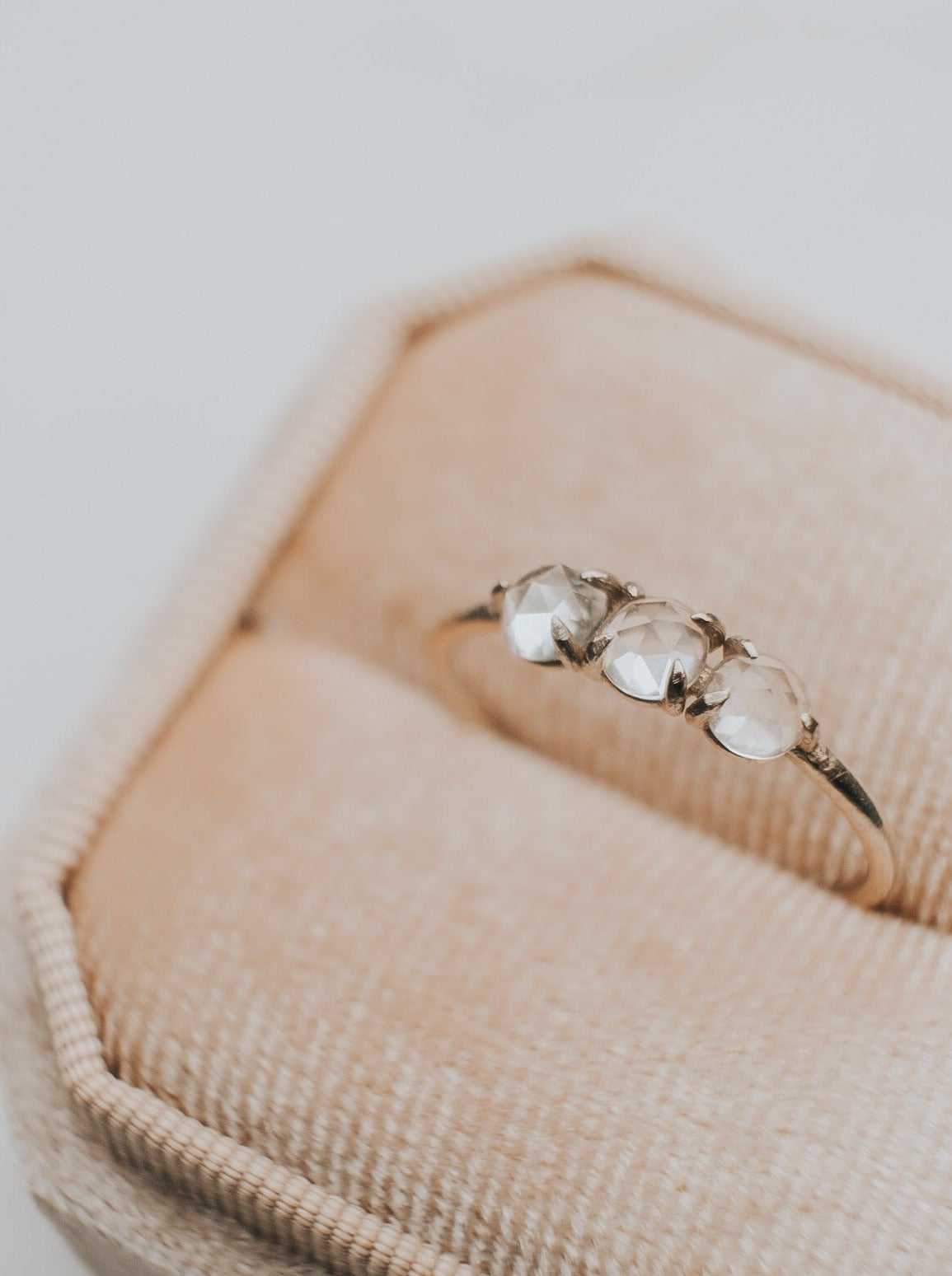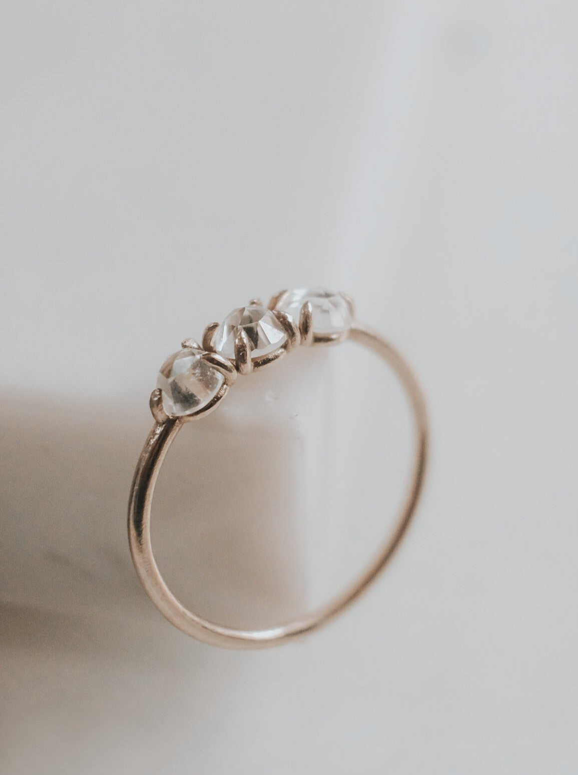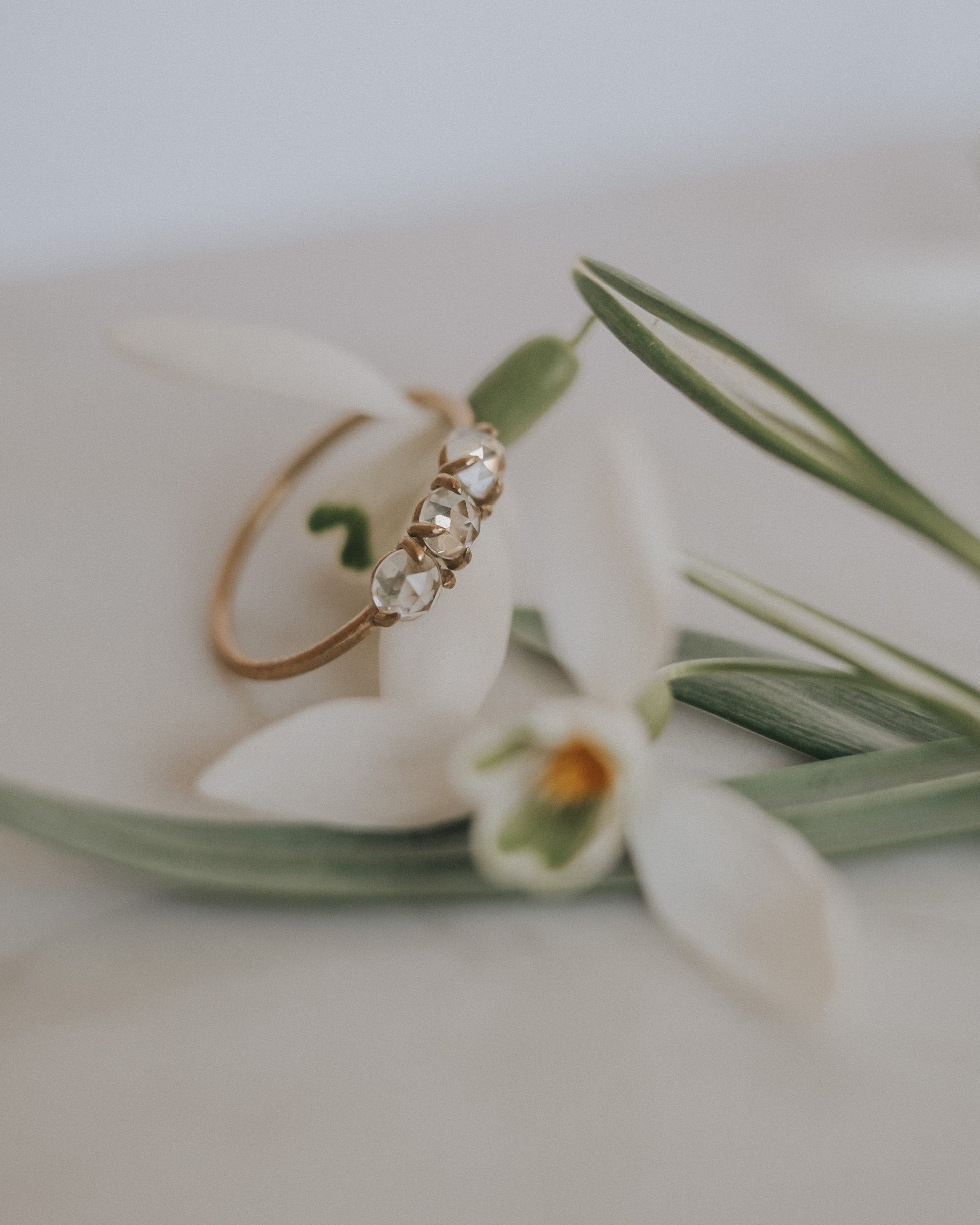 Lily Petite is the little sister of Lily Luxe, the difference being the size of the stone. Lilly Petite has three 4mm rose cut topaz where as the Lily Luxe has three 5mm rose cut topaz. For comparison both can be seen along side each other in the last four photos of this listing. Click here to view Lily Luxe.